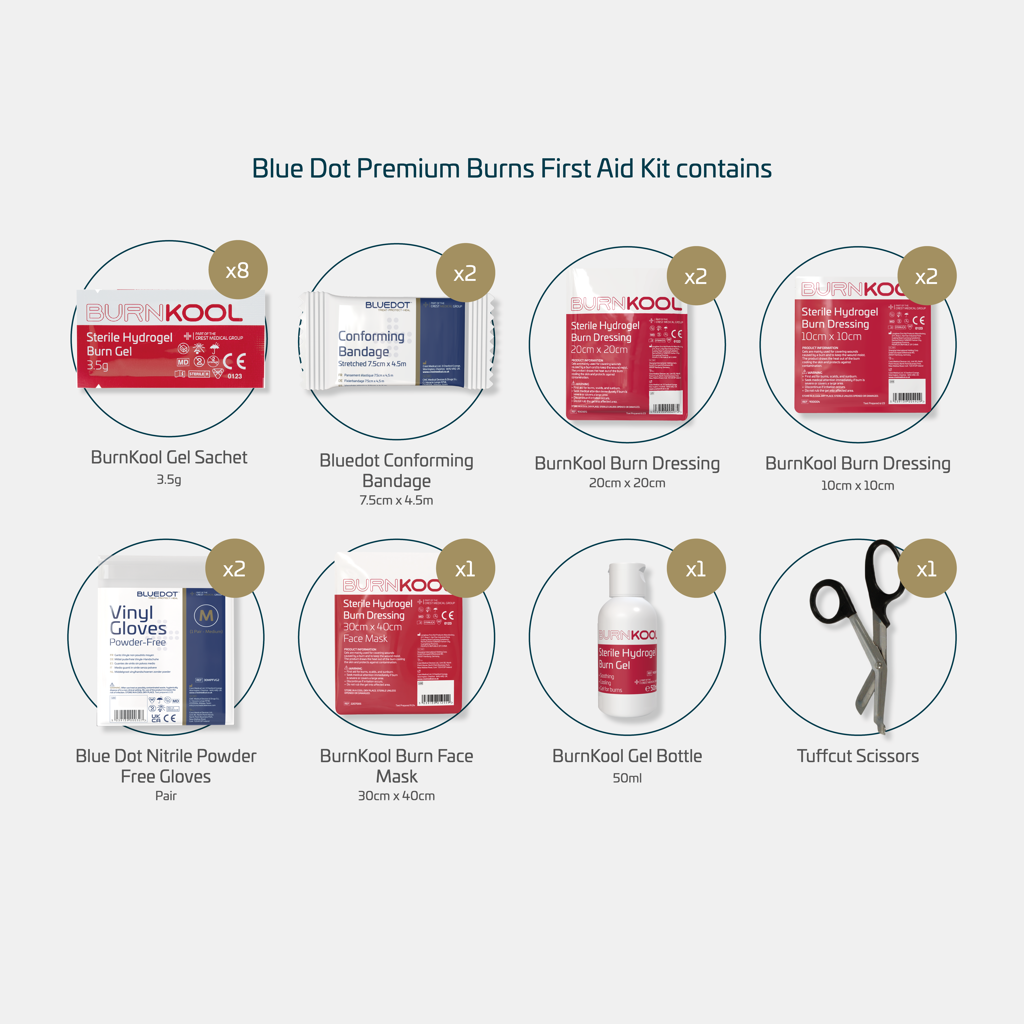 The Blue Dot Premium Burns First Aid Kit provides fast, effective treatment for burns and scalds, helping to relieve pain and protect the affected area. It features a comprehensive range of Burn Kool dressings, including a Burn Kool face mask, specially designed for facial burns to ensure safe and effective cooling.